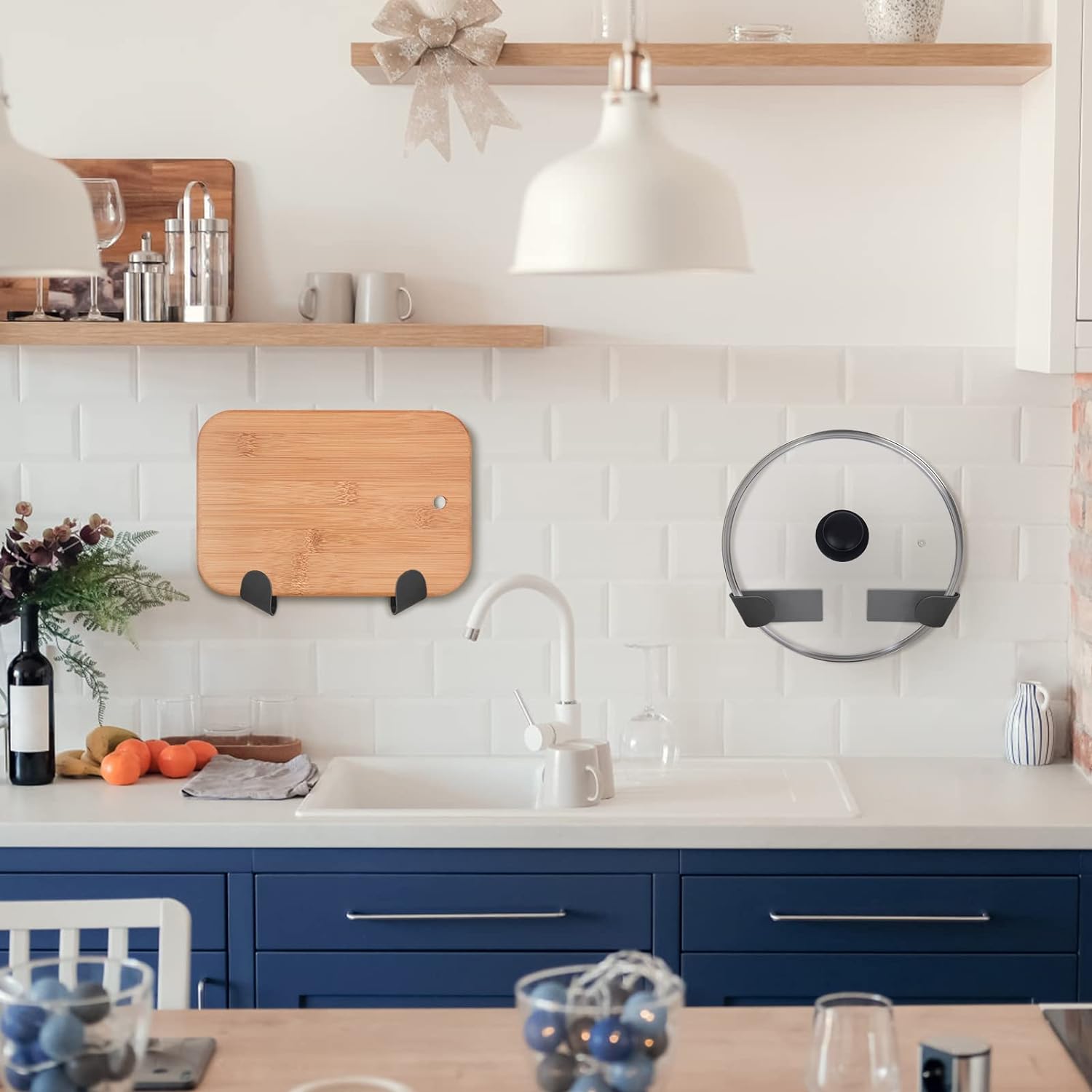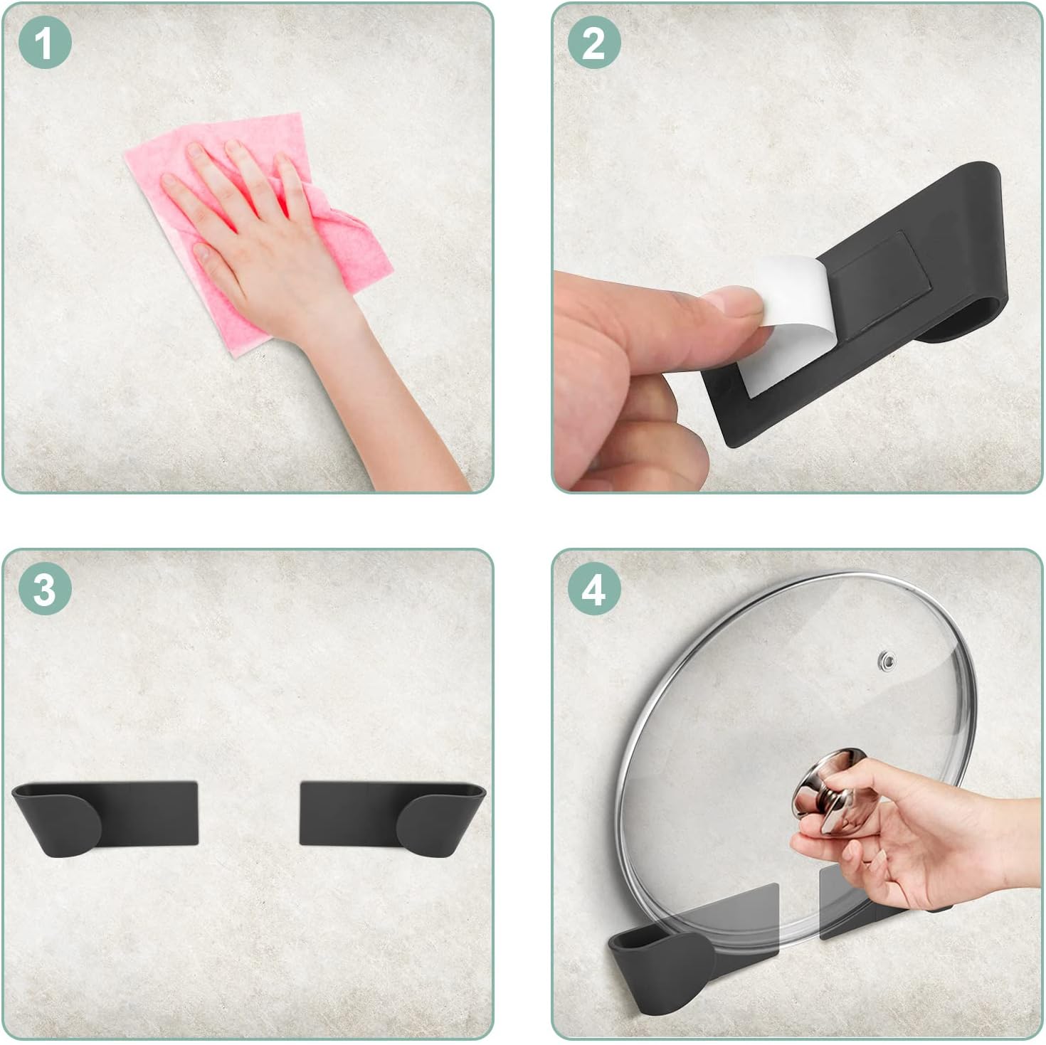 suporte de tampa de panela para pendurar na parede, pode pendurar a tampa da panela de forma estável na parede ou no armário da sua cozinha, economizando o espaço da cozinha. Pode ser instalado como um gancho e estrutura de suporte.